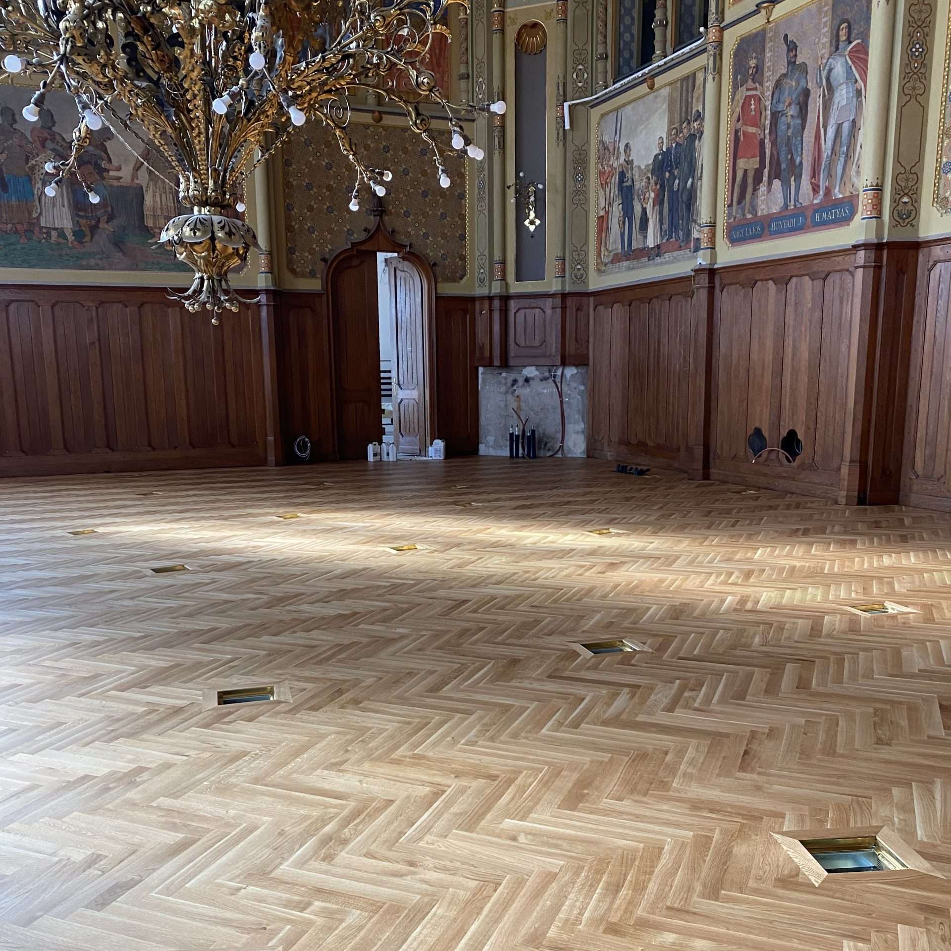 Többrétegű francia halszálka parketta 45°-ban / 60°-ban vágott végekkel. Egyszerű, letisztult, de mégis modern képet mutat a mintázata.